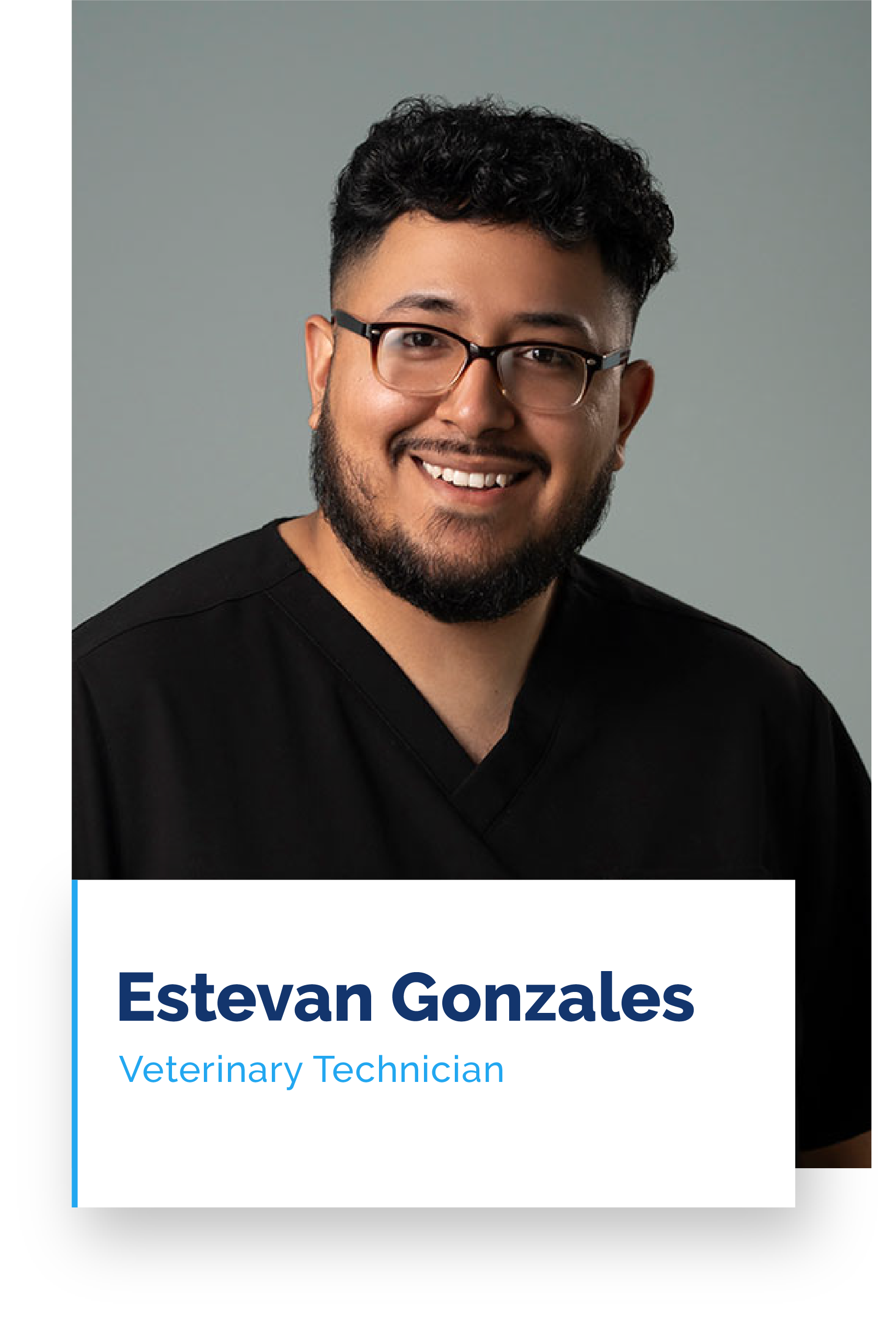 Estevan is a dedicated veterinary technician with a passion for animal care. Graduating as a certified veterinary assistant in 2018, he worked his way up to become a veterinary technician, honing his skills and expertise along the way. He enjoys assisting in surgeries and diligently monitoring pets under anesthesia. With a commitment to ensuring the well-being of every animal in his care, Estevan brings a blend of compassion and professionalism to his work. Outside of the clinic, he enjoys exploring scenic trails, strumming songs on his guitar, and immersing himself in various forms of art. Estevan’s love for animals extends beyond the workplace, making him an asset to any veterinary team.