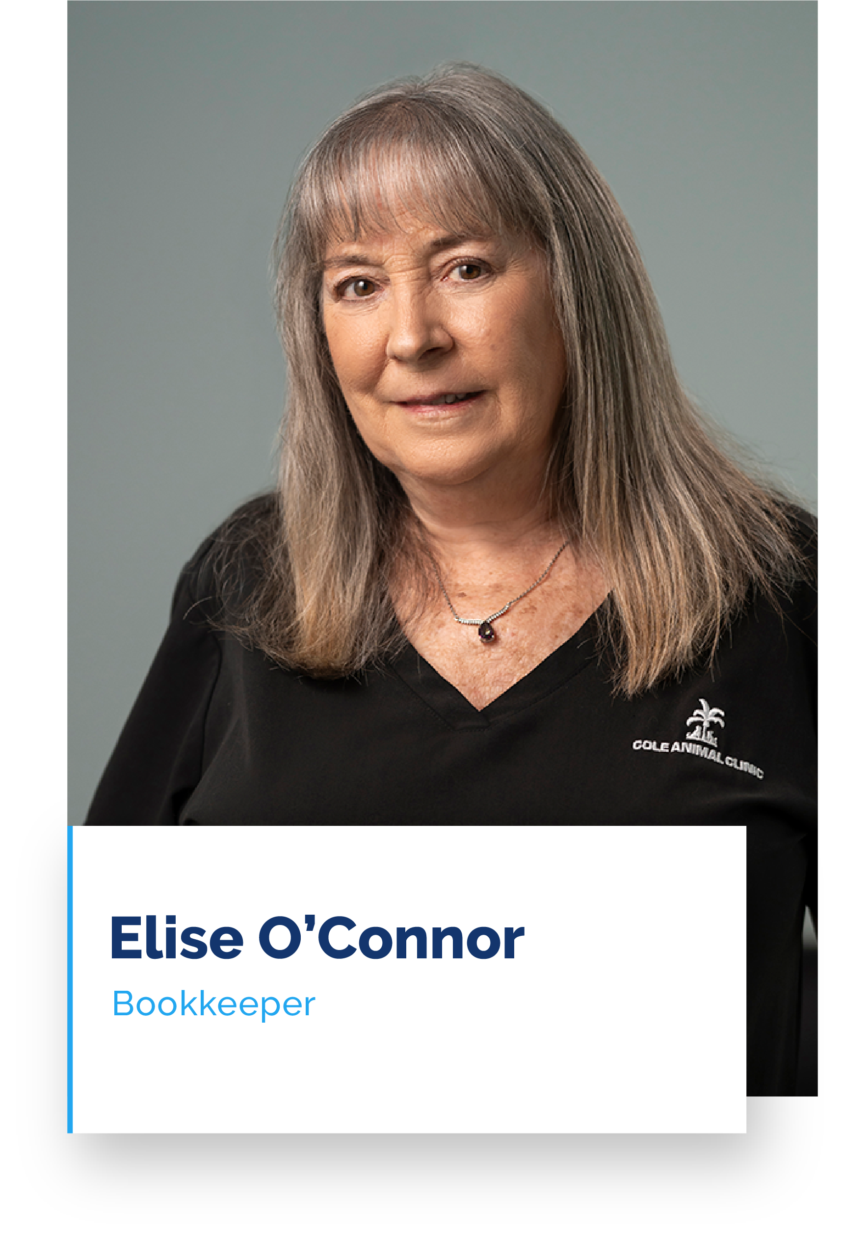 Elise O’Connor brings a wealth of experience and dedication to her role as the bookkeeper at Cole Animal Clinic. Originally hailing from New York, Elise now calls Delray Beach, Florida, her home. Since 2001, she has meticulously managed the clinic’s financial records, ensuring smooth operations and accurate bookkeeping. Before her tenure in the animal industry, Elise spent 18 years in the human medical field, honing her organizational skills and attention to detail. Beyond her professional life, Elise cherishes moments with her family—her husband, Harry, and their two beloved cats. Her commitment to both numbers and feline companions makes her an invaluable part of our team.